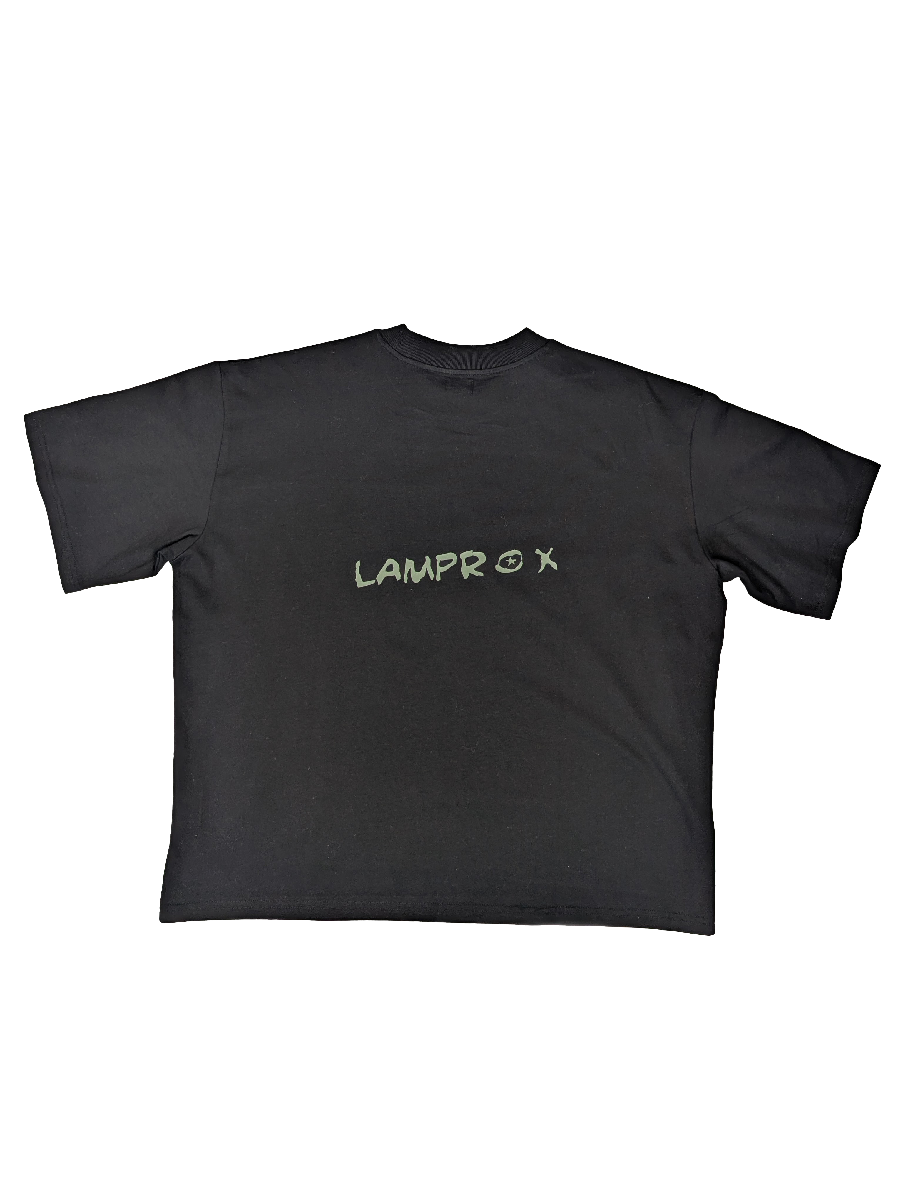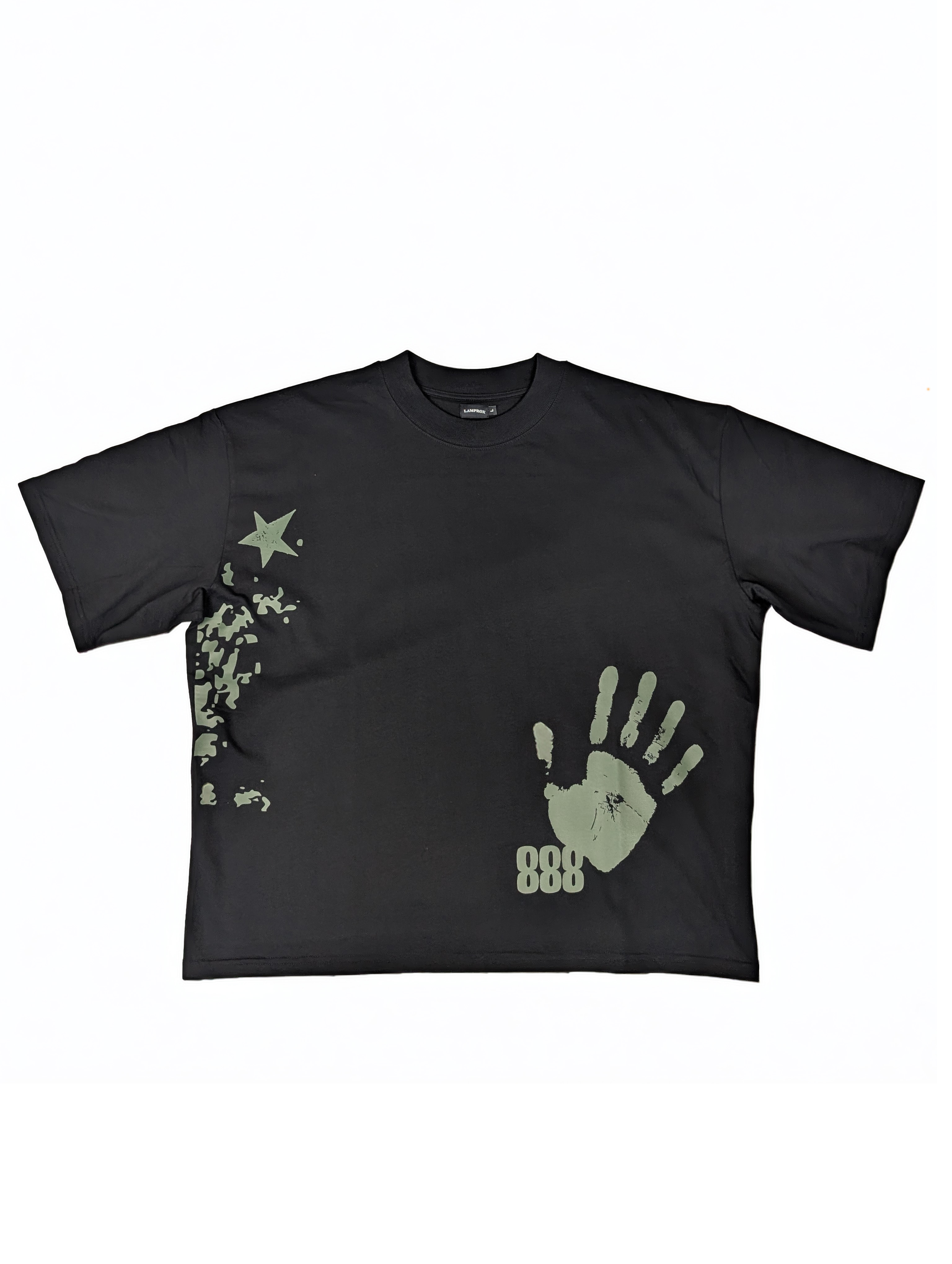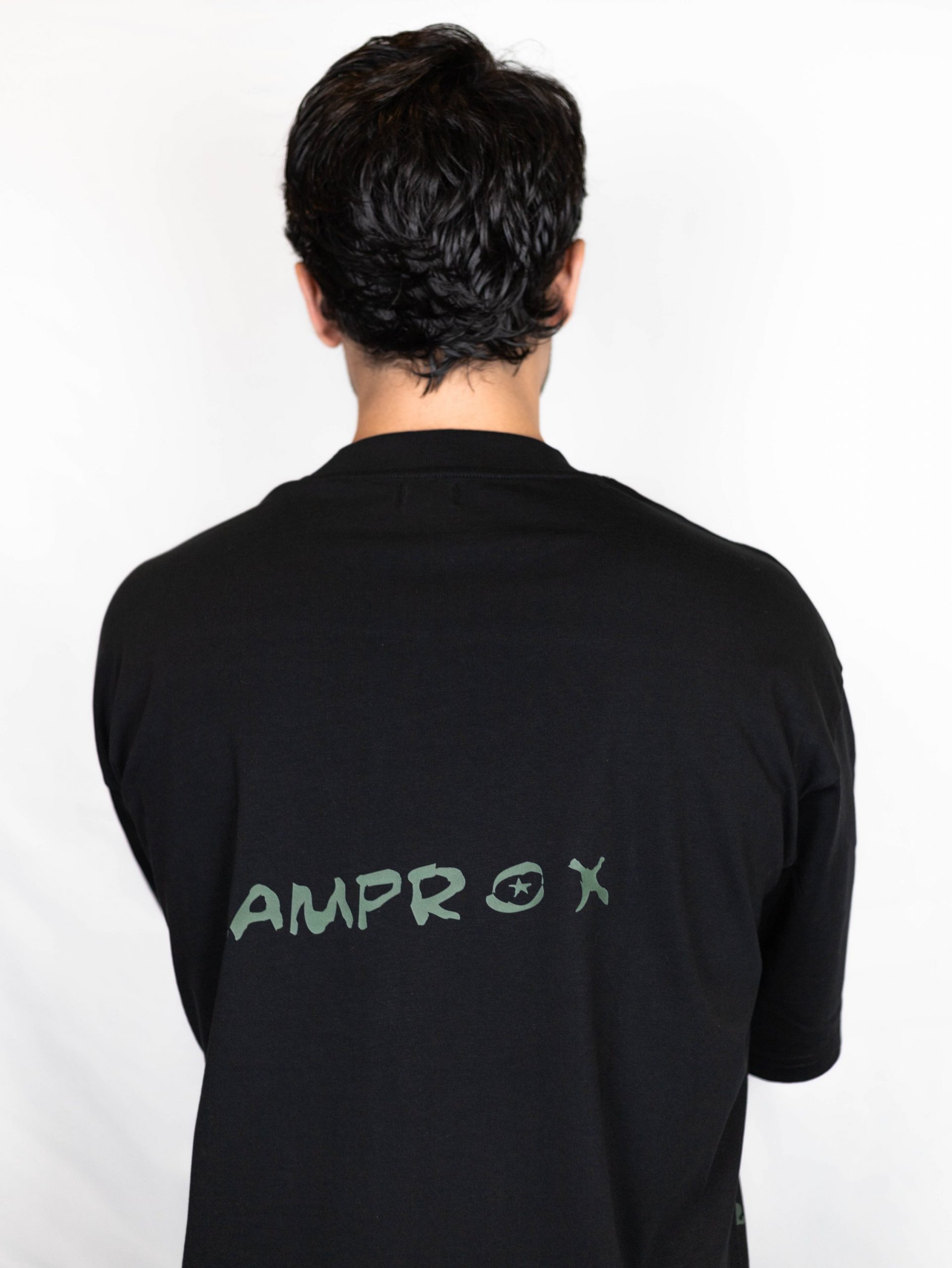 Camiseta oversize negra, ideal para el verano, con cuello de canale, con estampado en DTF, con un corte recto y un poco ancho para cualquier tipo de cuerpo.La parte inferior de la camiseta es un poco cropeada, a la altura de una camiseta regular